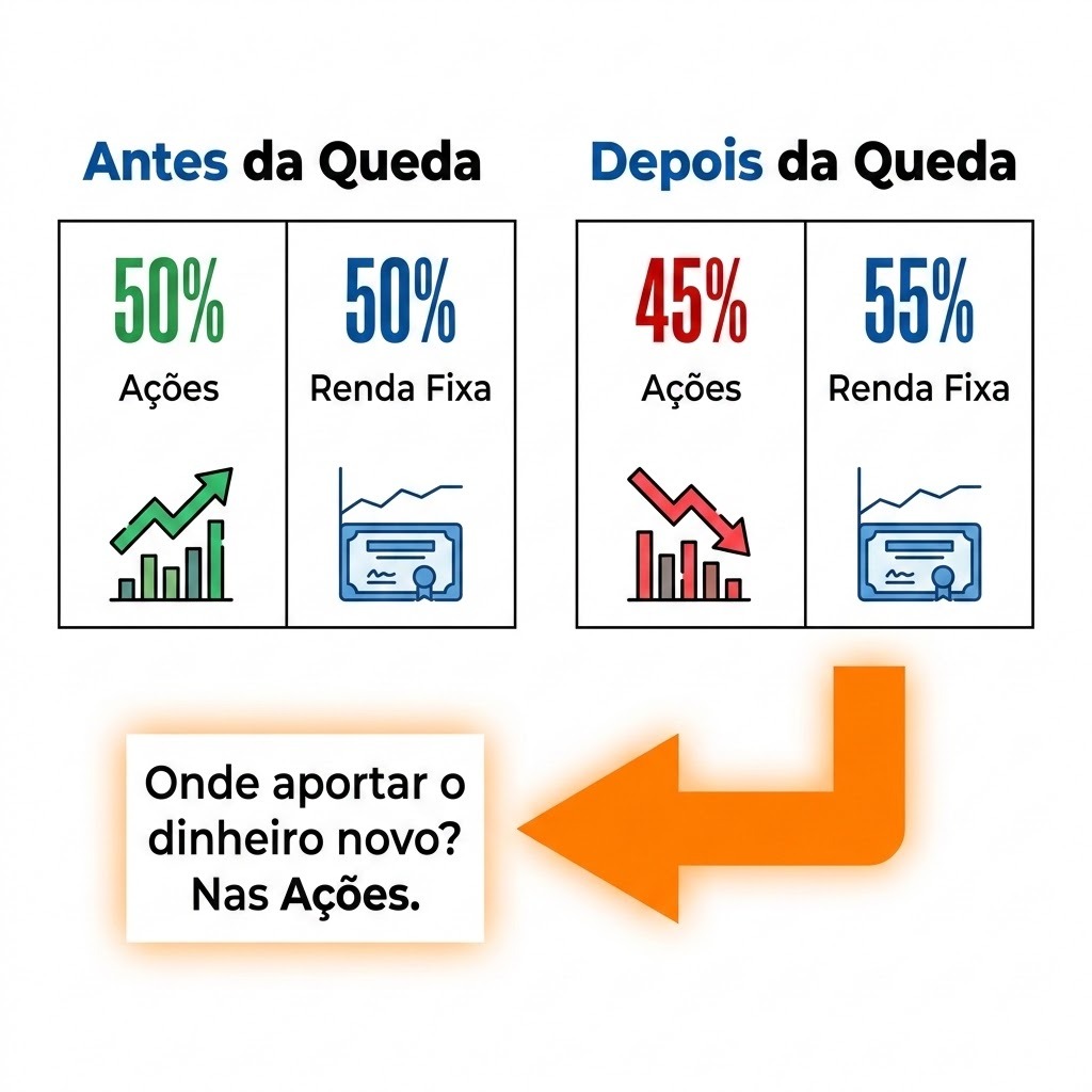 Quando ocorre uma “realização de lucros” maciça pelos fundos institucionais e o preço das boas ações cai, a proporção da sua carteira se desequilibra. As suas ações passam a valer “menos” temporariamente em relação à sua renda fixa. O que o investidor de alta performance faz? Ele utiliza o dinheiro novo (o aporte do mês) ou parte da sua reserva de oportunidade para comprar aquelas ações excelentes que agora estão em “liquidação”.