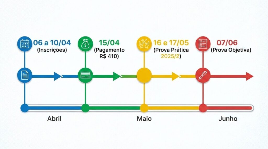 - Inscrições: ocorrem em uma janela curtíssima, de 6 a 10 de abril de 2026.