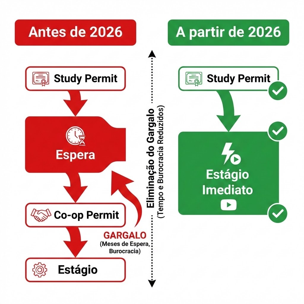 Até recentemente, os estudantes internacionais no Canadá enfrentavam um gargalo silencioso, mas profundamente estressante: o Co-op Work Permit. Se o seu curso exigisse um estágio obrigatório para a formatura (o famoso Co-op), a sua permissão de estudo (Study Permit) não era suficiente. Você precisava aplicar para um documento extra, aguardar semanas (ou meses) e cruzar os dedos para que o papel chegasse antes da data de início da vaga de estágio.