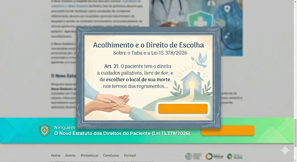 O Estatuto dos Direitos do Paciente assegura, em texto de lei, o direito de receber cuidados que visem estritamente o alívio da dor e do sofrimento. Mais do que isso: garante ao indivíduo o direito de escolher o local da sua morte, permitindo que, em vez de se isolar em uma UTI sob luzes brancas e alarmes, o paciente possa passar seus últimos momentos no conforto do seu lar, se assim desejar e for clinicamente viável. É a garantia legal da dignidade até o último milissegundo de consciência.
