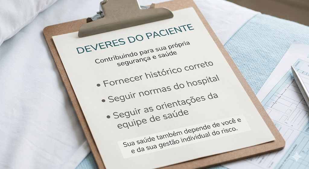 A Lei 15.378/2026 estabelece que o cuidado é uma parceria. O paciente tem a obrigação de fornecer o seu histórico de saúde de forma correta e precisa, seguir rigorosamente as orientações médicas pactuadas e respeitar as normas das instituições hospitalares.