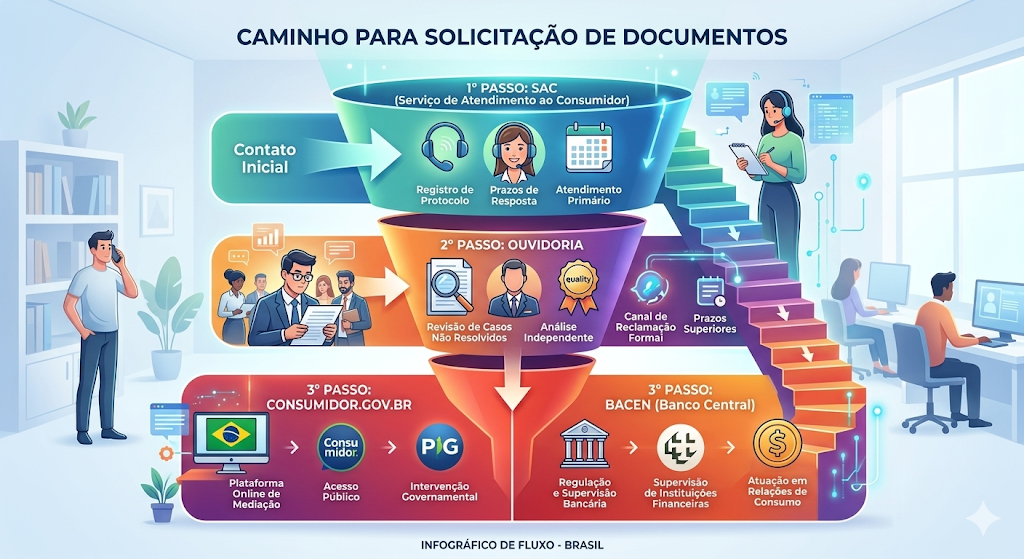 - Ainda sem solução? Registre uma reclamação detalhada no site Consumidor.gov.br e no Banco Central do Brasil (Bacen). O simples fato de registrar a reclamação nessas plataformas federais geralmente faz com que o setor jurídico do banco envie a documentação correta em poucos dias.