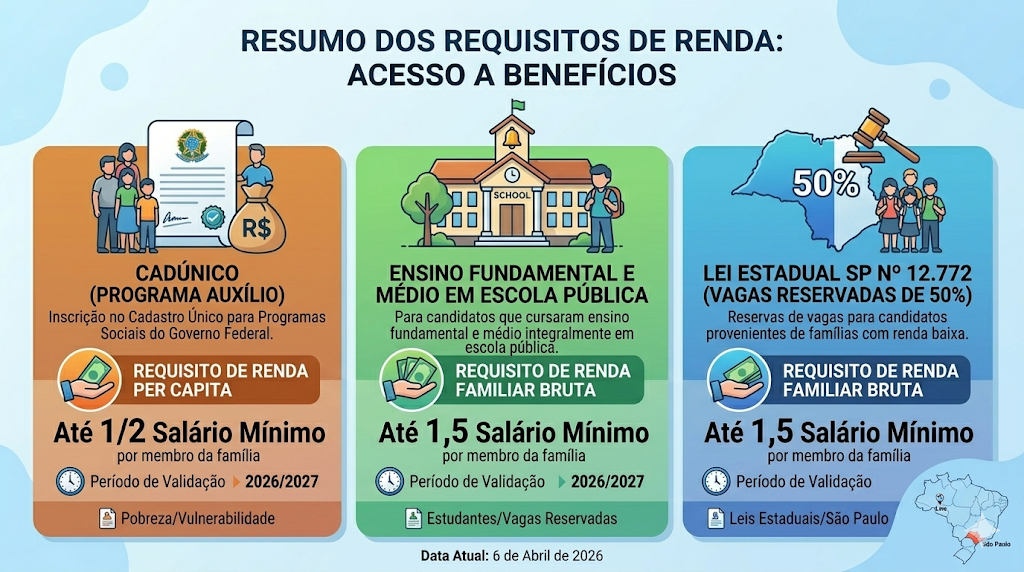 Voltada para quem cursou todo o Ensino Médio na rede pública (ou com bolsa de 100% na rede privada). Para ter direito, é necessário comprovar renda familiar bruta de até 1,5 salário mínimo por pessoa e morar ou estudar no Estado de São Paulo.